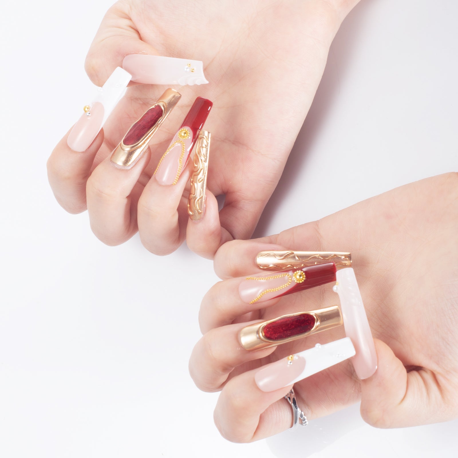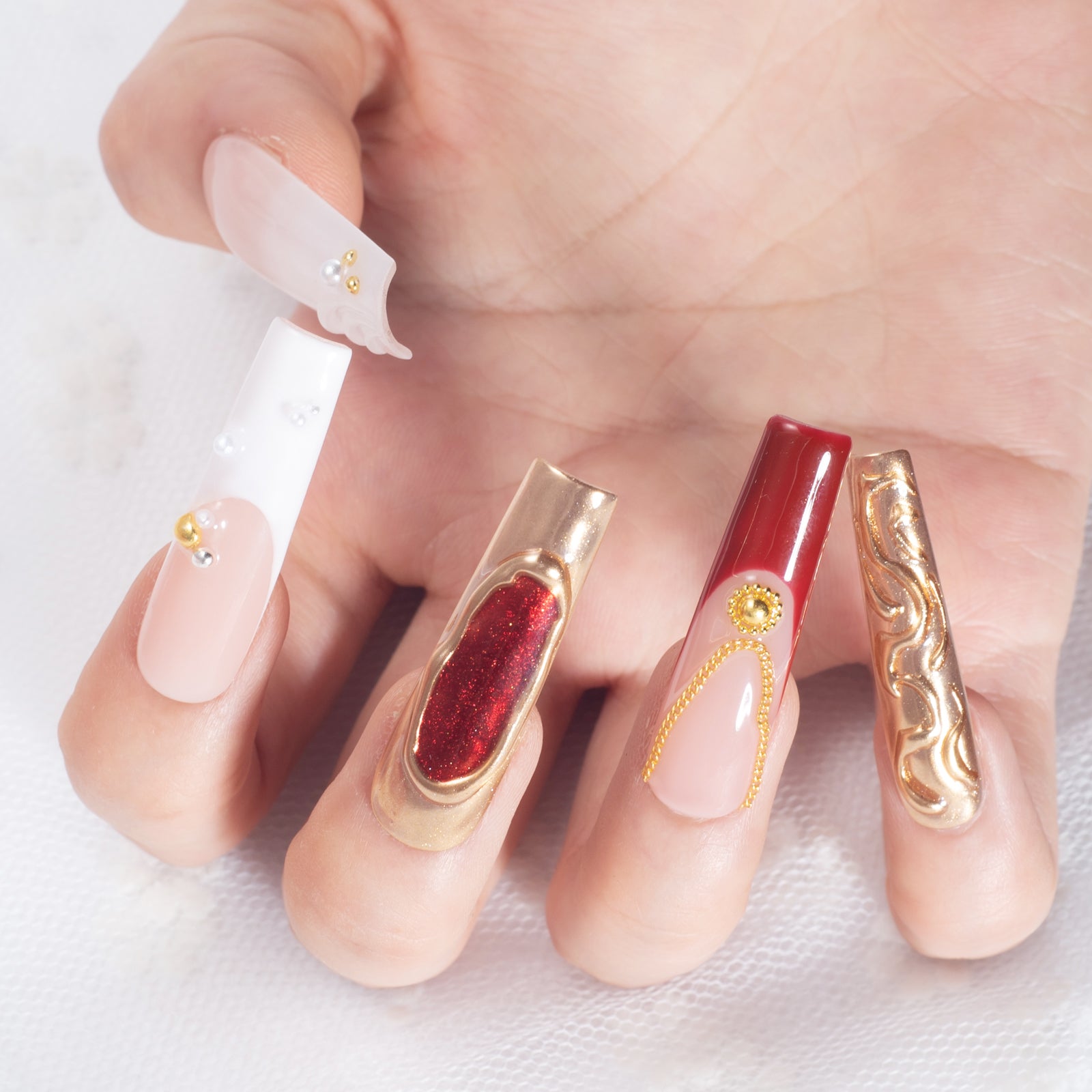 Make a bold statement with our "Royal Crimson & Chrome" handcrafted nails. This set is a high-fashion fusion of deep red cat-eye effects, metallic gold mirror finishes, and intricate hand-painted relief textures. Inspired by Baroque jewelry and modern industrial aesthetics, these nails offer a heavy-metal luxury vibe that transforms your hands into a work of art.